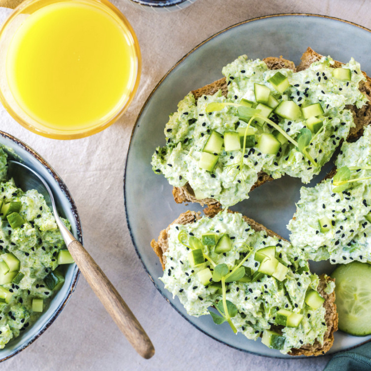 Das Brot aufschneiden und den fertigen Aufstrich mit den übrigen Gurkenstücken verteilen. Wer mag, kann noch schwarzen Sesam drüberstreuen.